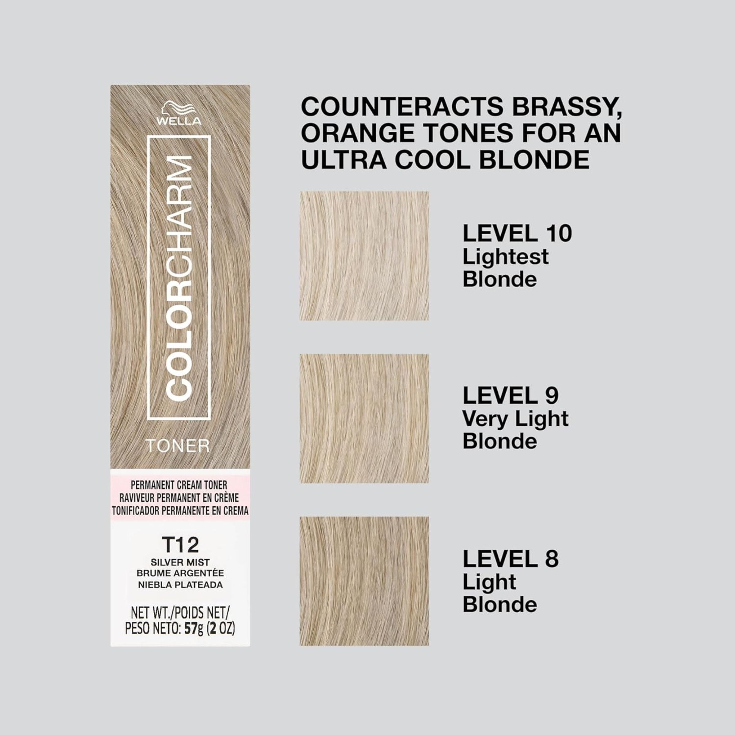 A very frosty, silver blonde with hints of vanilla. The Wella Color Charm T12 Silver Mist Permanent Crème Toner is a easy to use and works to tone down brassy yellow and orange tones, giving you a salon quality blonde from home.