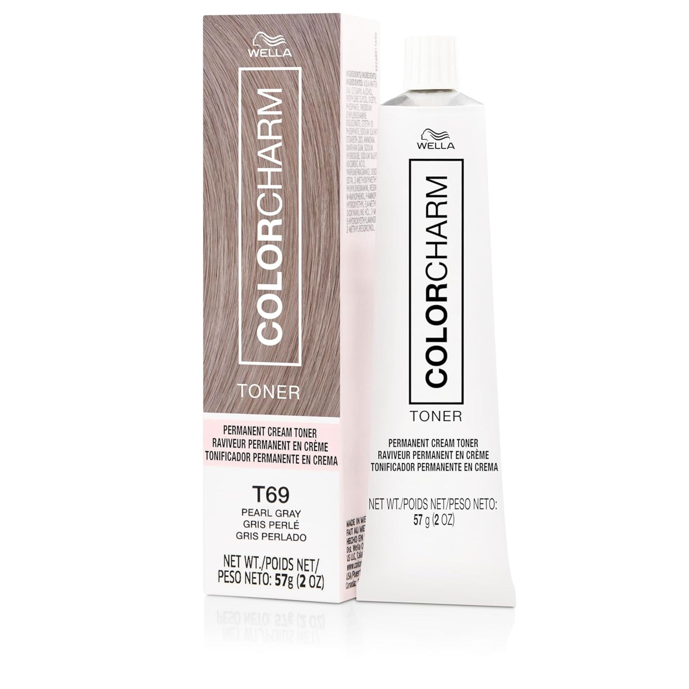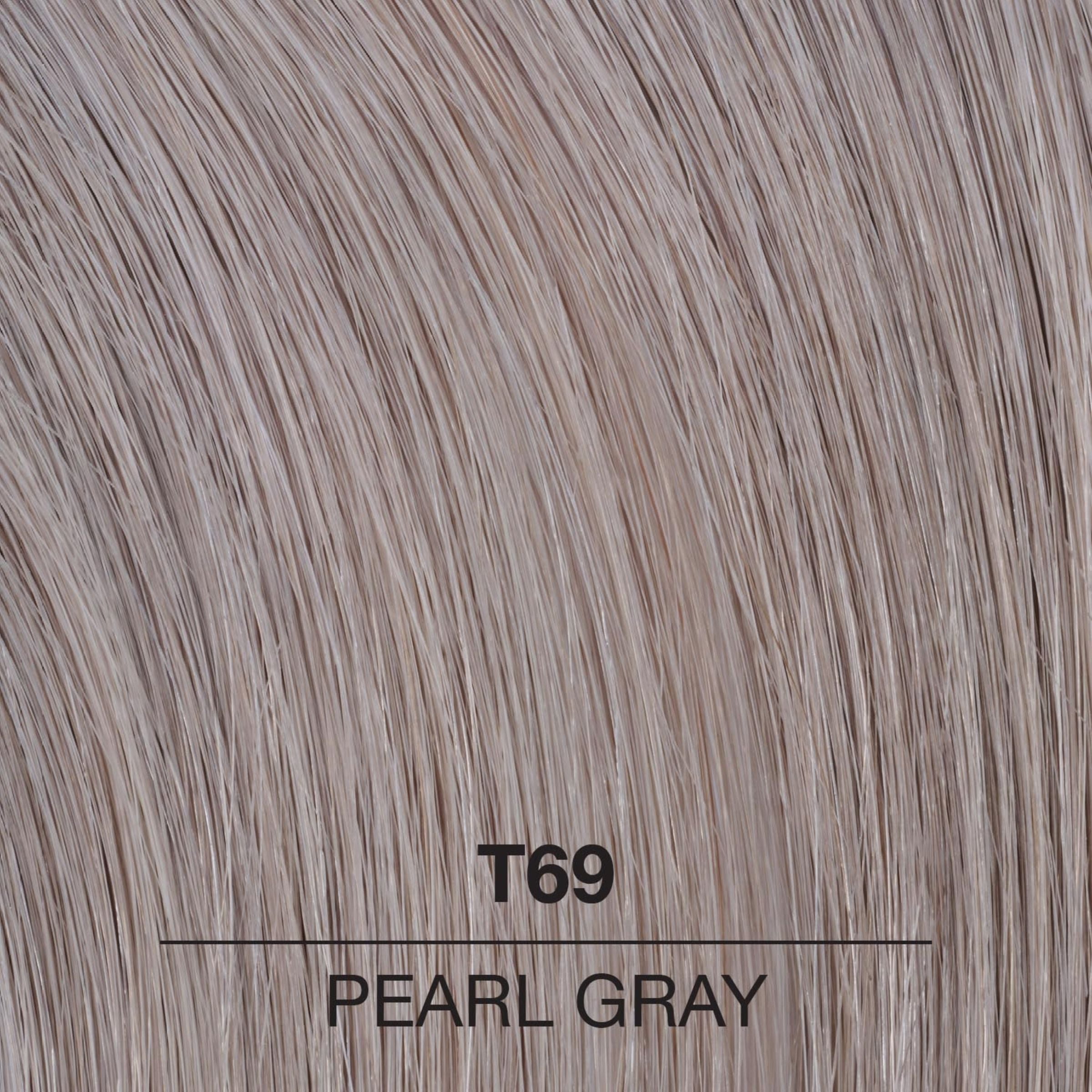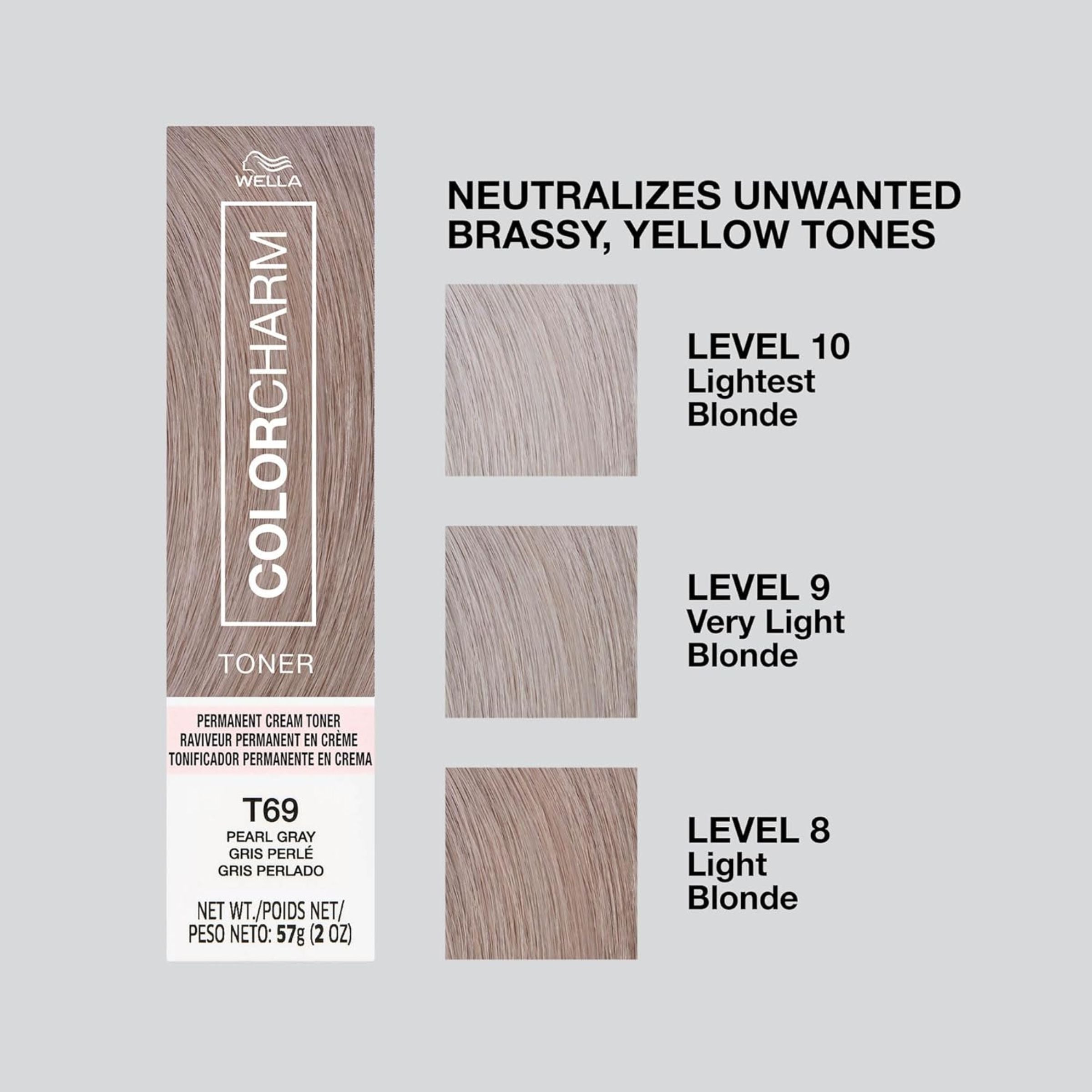A very ashy blonde with a pearly sheen so it doesn't look flat. The Wella Color Charm T69 Pearl Grey Permanent Crème Toner is a easy to use and works to tone down brassy yellow tones, giving you a salon quality blonde from home.
